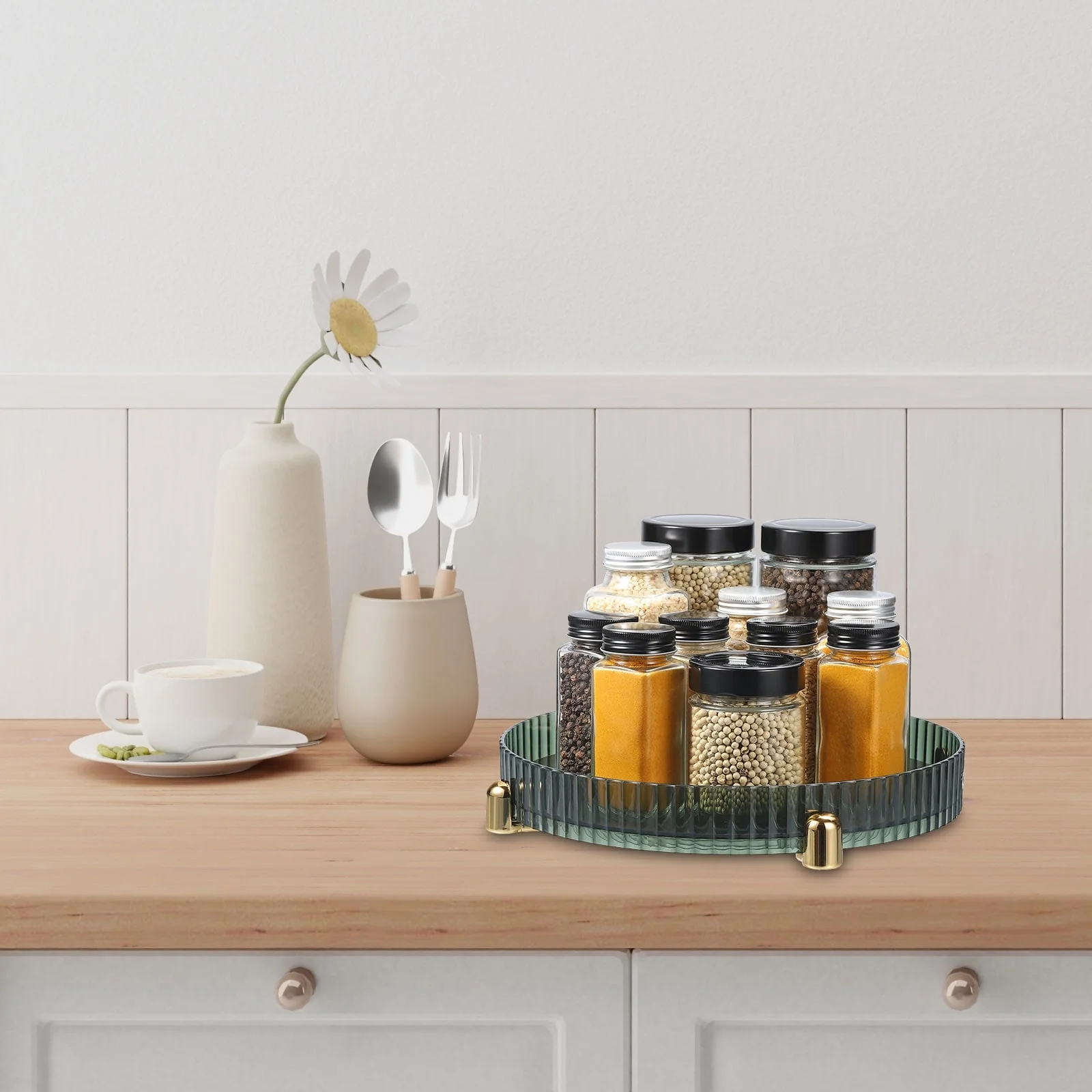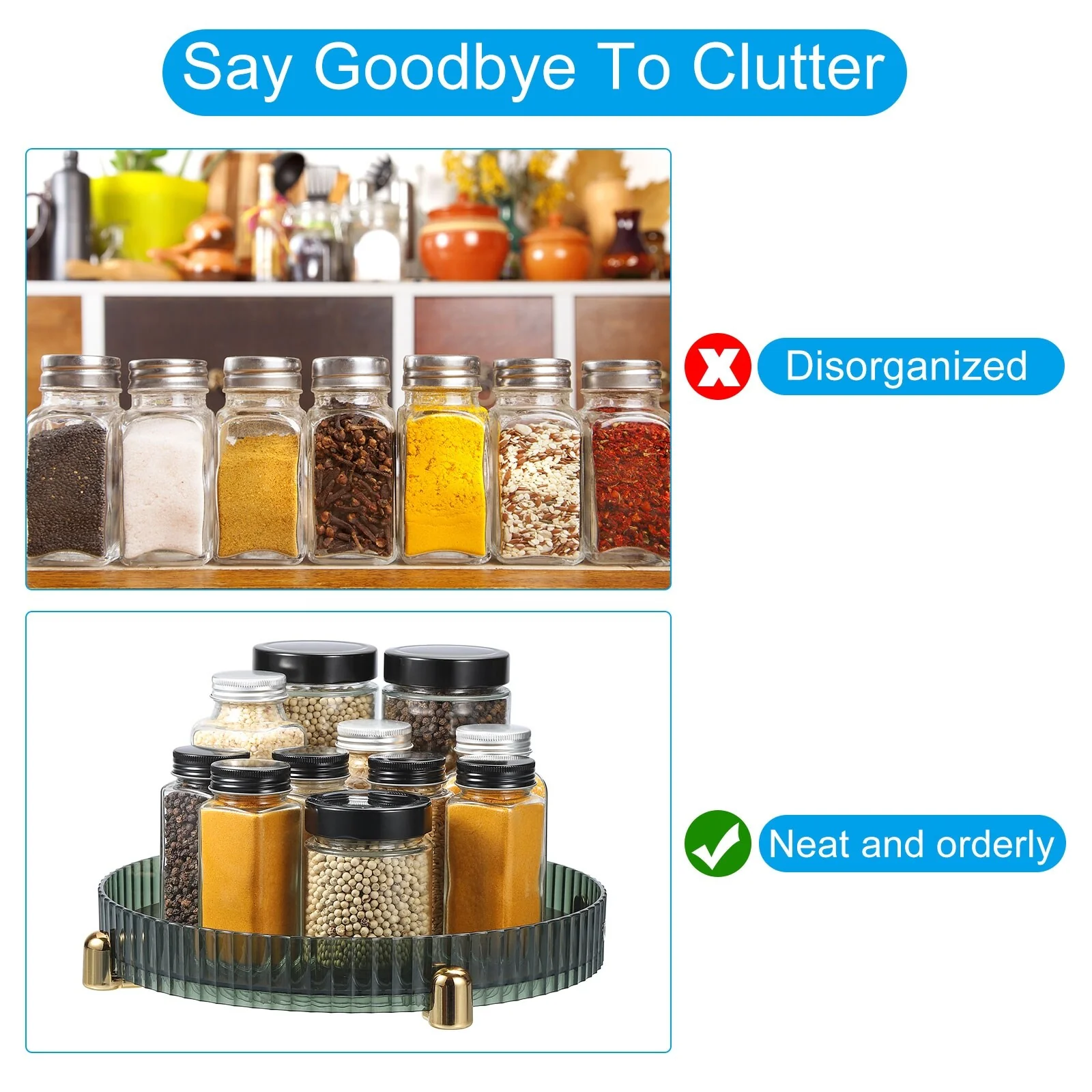 The spice organizer is designed with 360 degree rotating, easy to access and convenient for you to pick up anything from the tray.