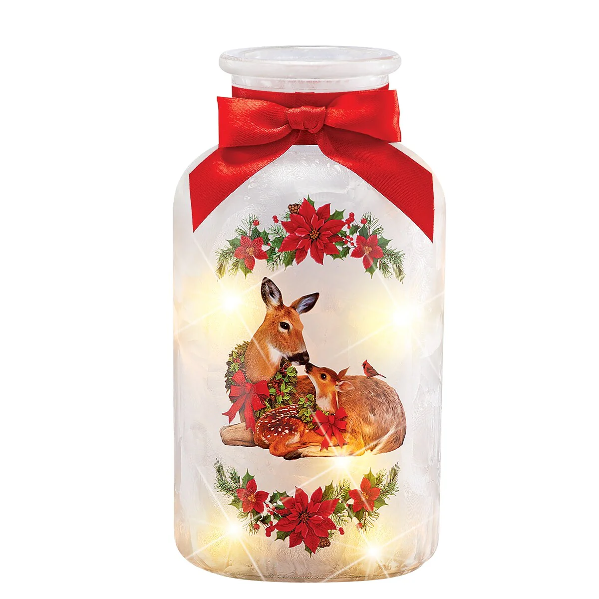 Decorate your home with this adorably detailed mason jar lamp. The frosted jar features a gnome with a tall, plaid hat in shades of orange, brown and yellow. Colorful leaves, berries and sunflowers decorate the jar, a burlap bow wraps around the top and lights inside add some sparkle and shine. Req. 2 "AA" batteries (sold separately). Glass. 4"Dia. x 7 3/4"H.