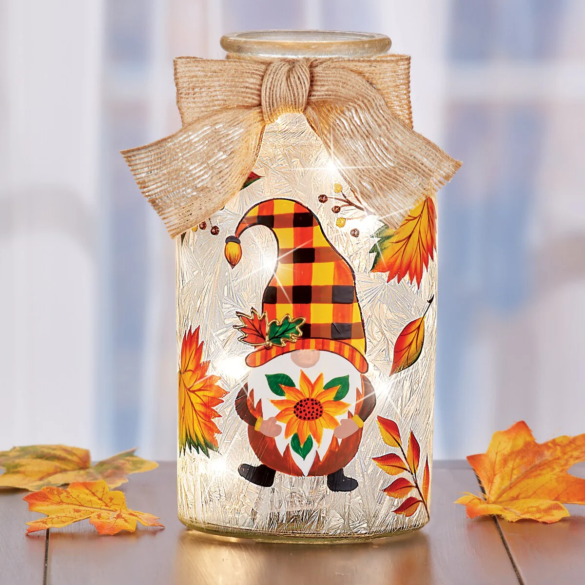 LED Lighted Autumn Gnomes Mason Jar Lamp – 10.500 x 7.000 x 6.750