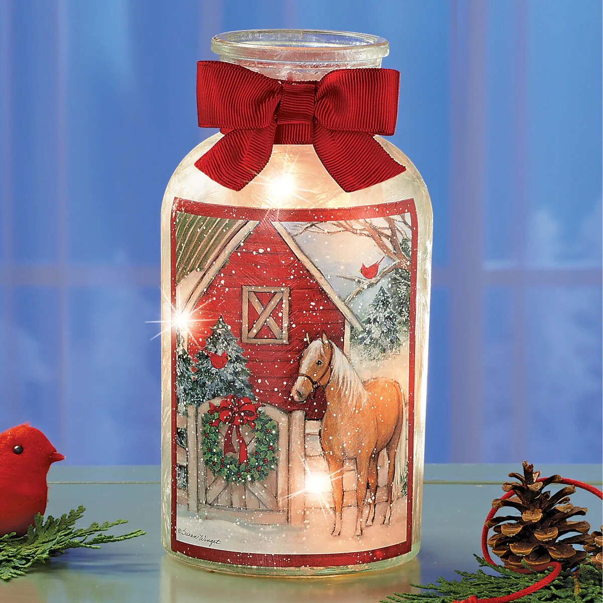 With a lovely design by artist, Susan Winget, this mason jar lamp is a festive addition to your holiday decorating. The frosted jar features a horse in front of a snow covered red barn with cardinals in the trees, while a bright red bow wraps around the top and lights inside sparkle and shine. Plugs into AC outlet. Glass, polyester and plastic. 4"Dia. x 8"H.