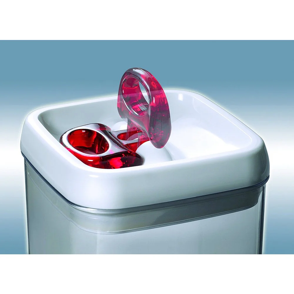 Keep chips, pasta, and cereal fresher, longer with this square storage container. A unique and patented one-hand locking system creates and air- and water-tight seal so your dry goods will keep. Clear containers make it easy to take a quick inventory, and the white opening makes filling and using super quick.Â