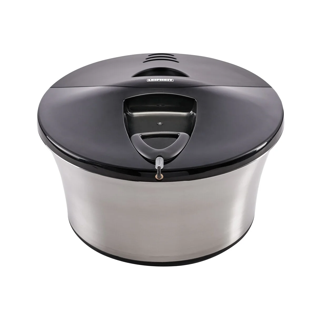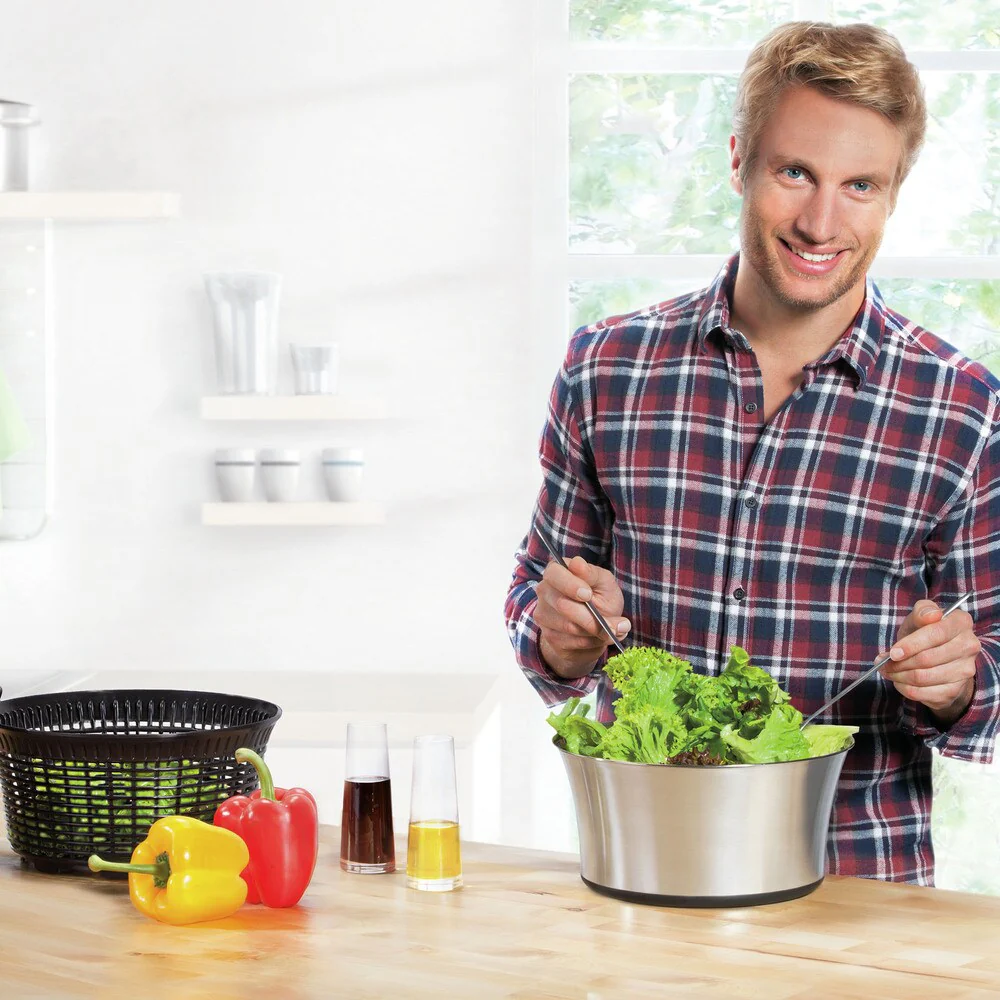 Create beautiful salads in no time with this modern salad spinner. Crafted from stainless steel, this durable spinner is gentle on salad leaves and ensures a dry, unbruised meal. Featuring a nonslip base, the bowl stays put while in use and also detaches to create a beautiful serving bowl that complements a contemporary kitchen decor.