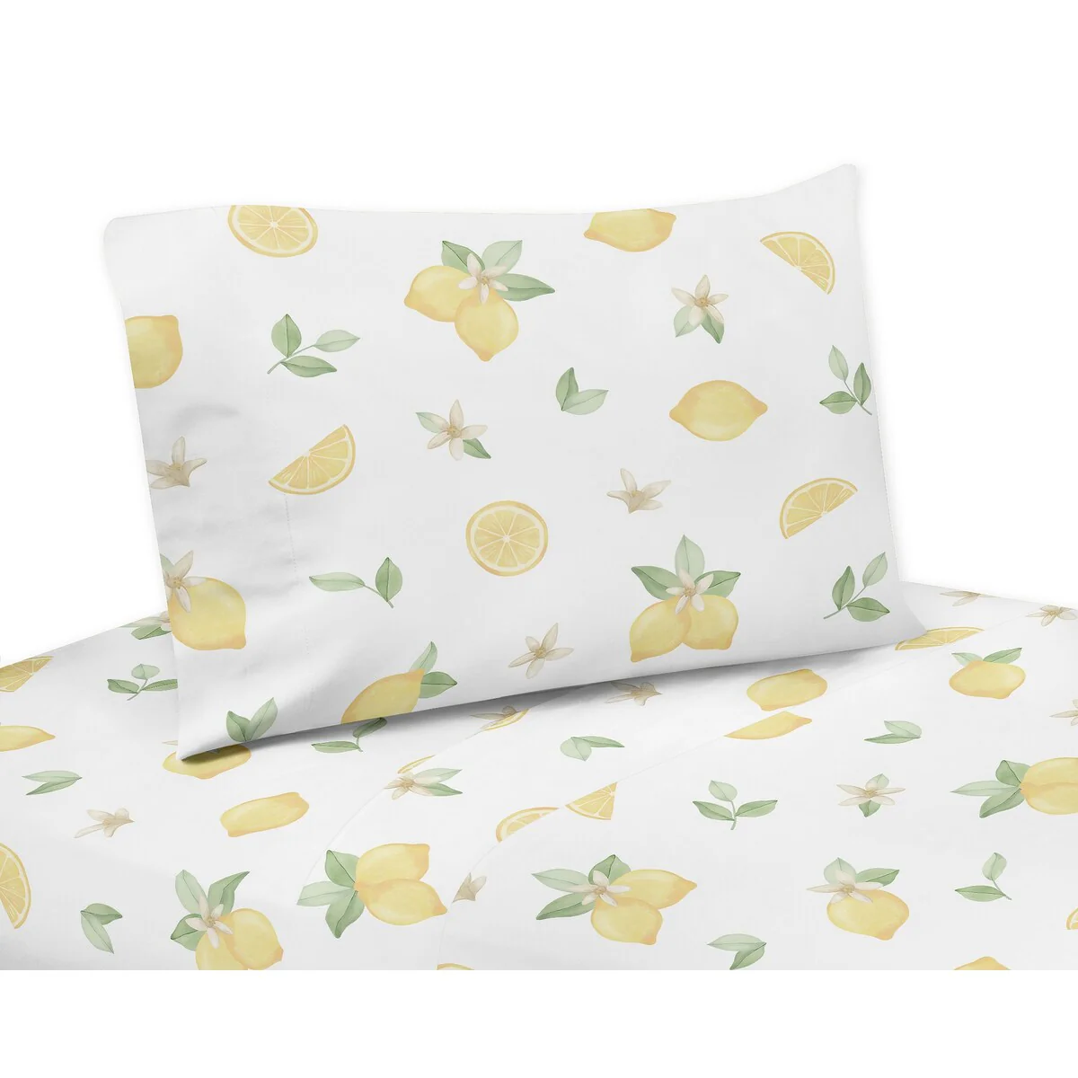 Lemon Collection 3 Piece Twin Sheet Set will help complete the look of your Sweet Jojo Designs room. This yellow, green, beige and white lemon floral print brushed microfiber fabric sheet set fits all standard twin size mattresses and is machine washable for easy care. Twin Sheet Set Includes: Fitted Sheet, Flat Sheet and Pillow Case.