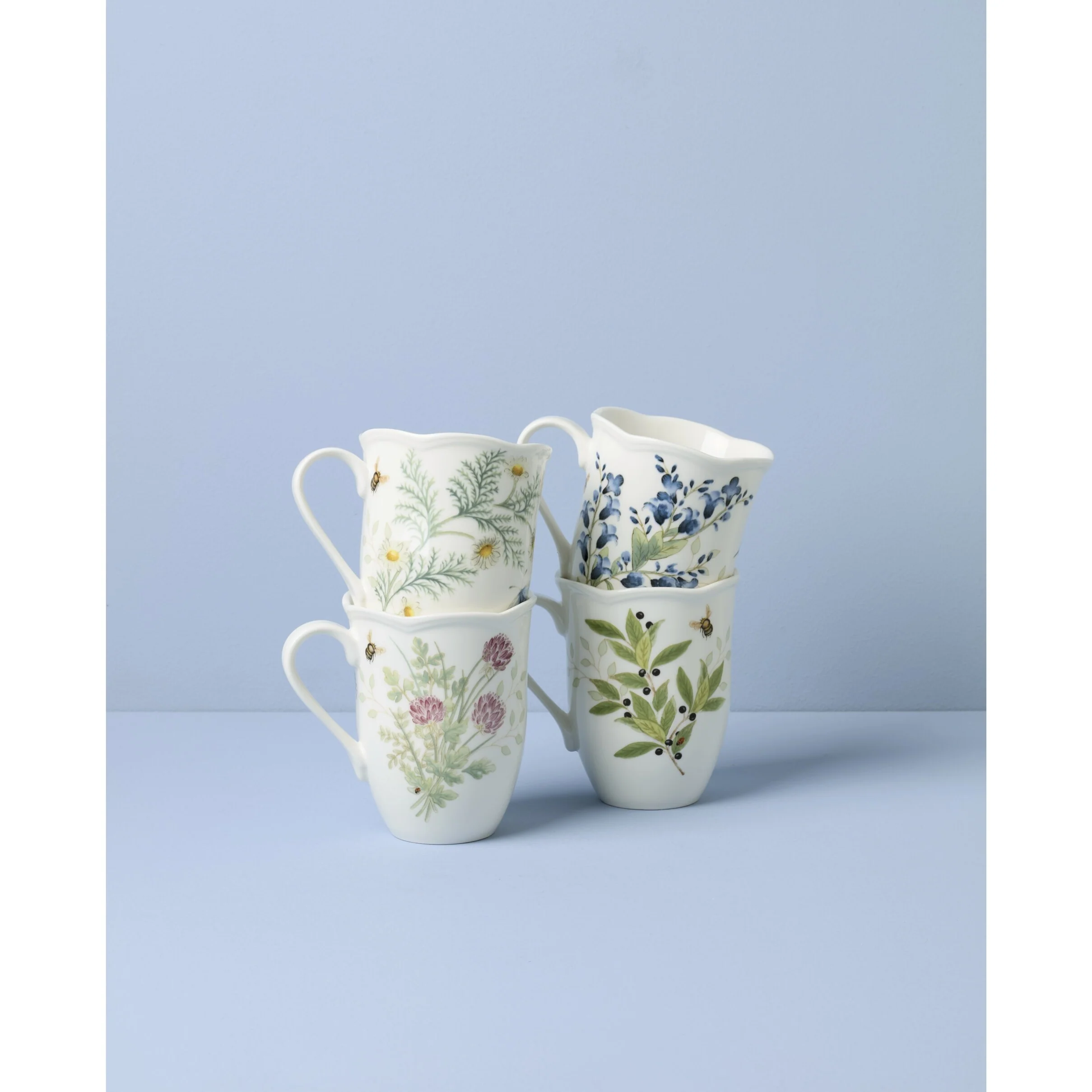 - (4) mugs, Each measures 4.25"H x 3.375"Diameter; 12-oz capacity