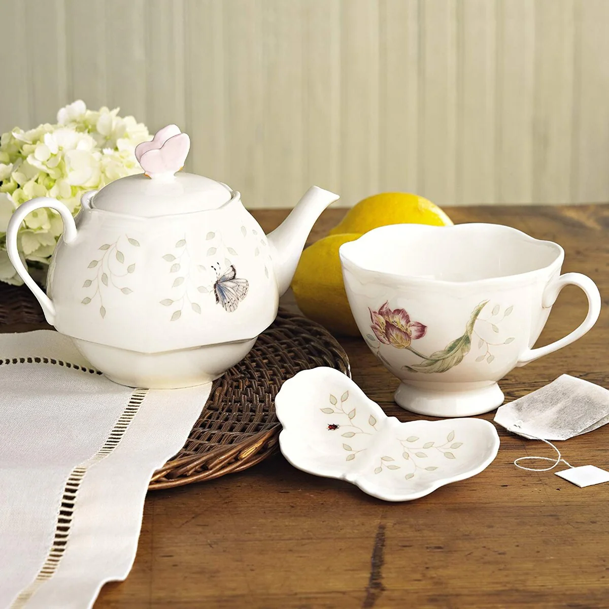 The most popular casual dinnerware collection in America, Butterfly Meadow is truly a contemporary mix and match classic. Inspired by the artistry of Louise Le Luyer, there are many delightful pattern varriations to choose from, each offering an exquisite array of butterflies, blooms and other wonders of nature, all rendered in a soft color palette. Crafted of the finest Lenox porcelain, Butterfly Meadow is the perfect choice for today. All of the dinnerware is safe for use in the dishwasher, the microwave and guarantees superior freezer to oven to table performance. Designed for chip-resistant durability, Butterfly Meadow will take a cherished place in your home for many years and offers the opportunity to expand your collection with the incredible range of dining, decor and gift giving choices available. Best of all, this versatile, stylish and fun collection is created by Lenox, America’s first name in home entertaining. Known around the world for offering a unique combination of design, artistry and superior quality for over 125 years, Lenox has unmatched durability and is backed up by a lifetime replacement program to guarantee many years of enjoyment. A perfect tea for one to warm you up! Giftboxed 4 piece stackable set includes a 7" teapot and lid which holds 18 oz, a tea cup which provides the base of the set and a butterfly-shaped tea bag holder. Just add tea and water!