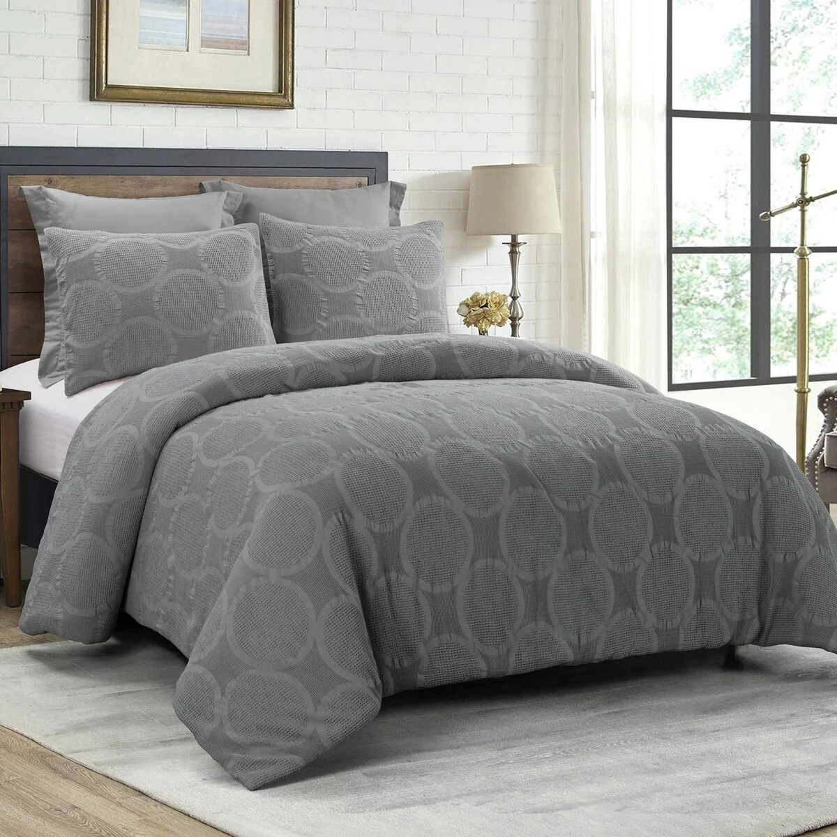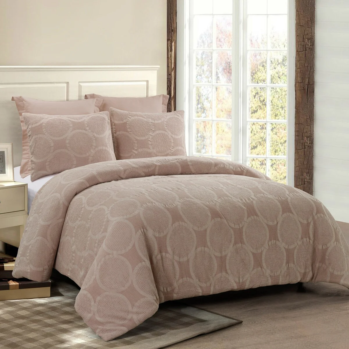 This elegantly designed Leon 3-piece cotton comforter set is a luxurious addition to any master bedroom or guest room. The ultra-soft 100% cotton jacquard fabric is garment washed to provide a wonderfully soft touch. This bedding set is designed using a waffle weave fabric with a modern geometric pattern. A hidden pin tuck secures the batting in place without interrupting the pattern, creating a smooth, seamless appearance. Shams are included and perfectly match the comforter to complete the look of the bed. This 3-piece set comes with 1 comforter and 2 shams, and is packaged in an eco-friendly linen bag. Available in the colors Grey and Blush.