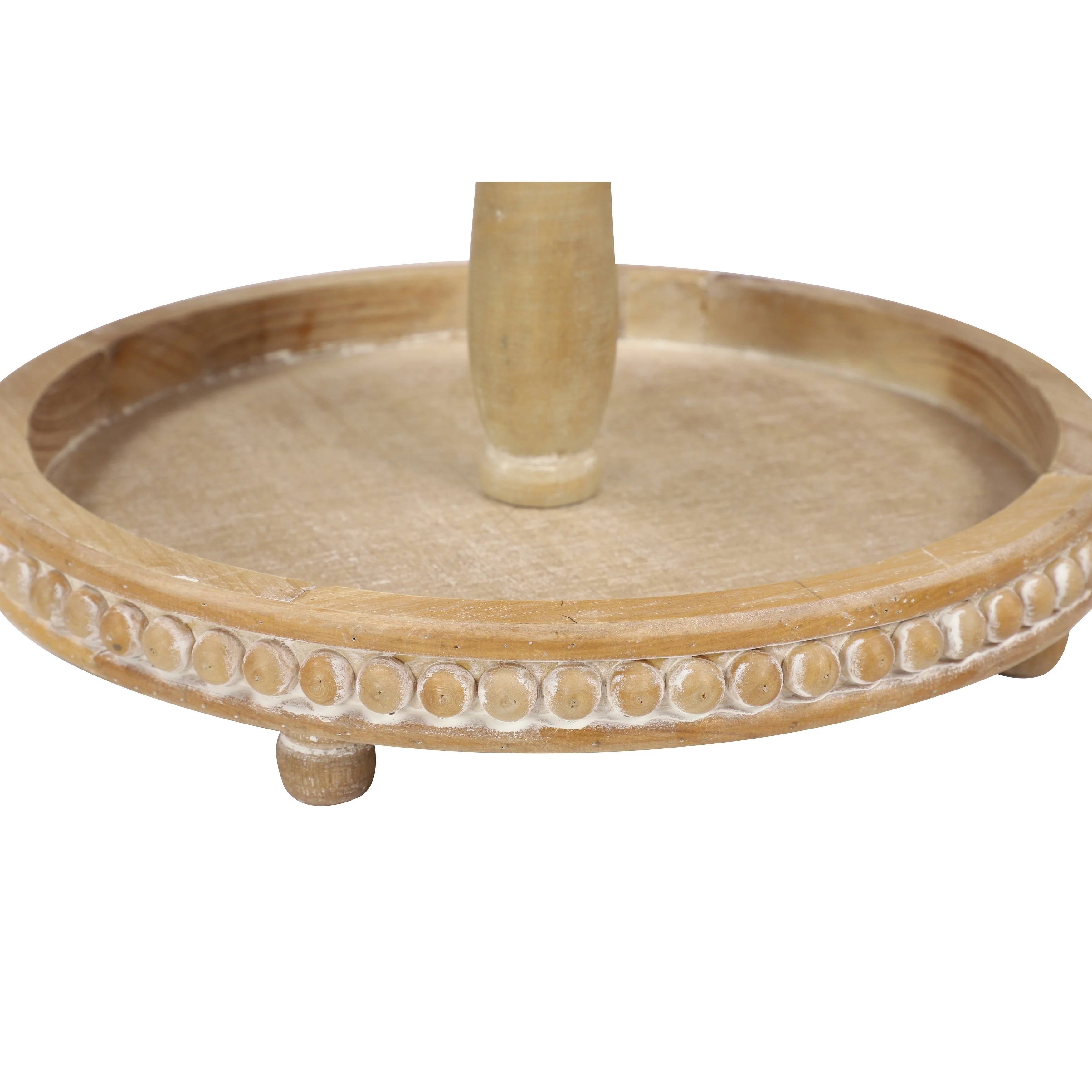 - 2-Tier tray with decorative wood beads and a whitewash finish over the light beige birch and MDF circular trays and turned center posts