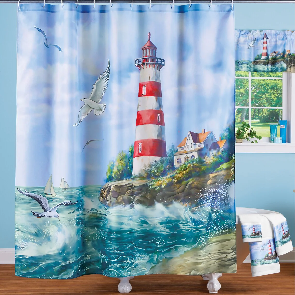 Escape to a seaside retreat with this beautiful shower curtain. Featuring a classic striped lighthouse, crashing waves and a rocky shoreline, the lovely design is a must for your coastal bath. Includes 12 plastic hooks for easy hanging. Machine wash. Polyester; imported. 70"L x 70"W. Shower hooks: 2 1/4" L x 1 1/2"W each.