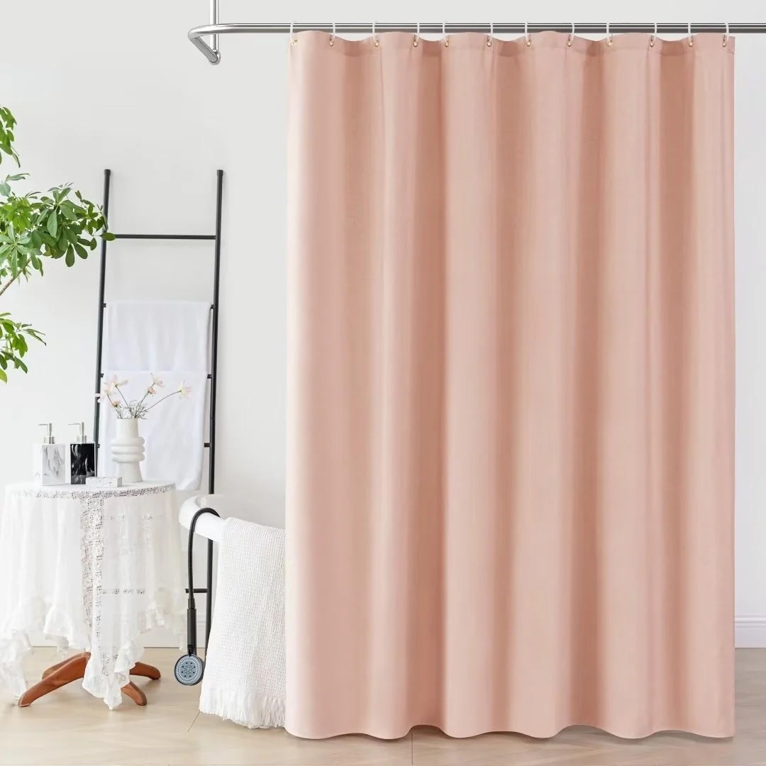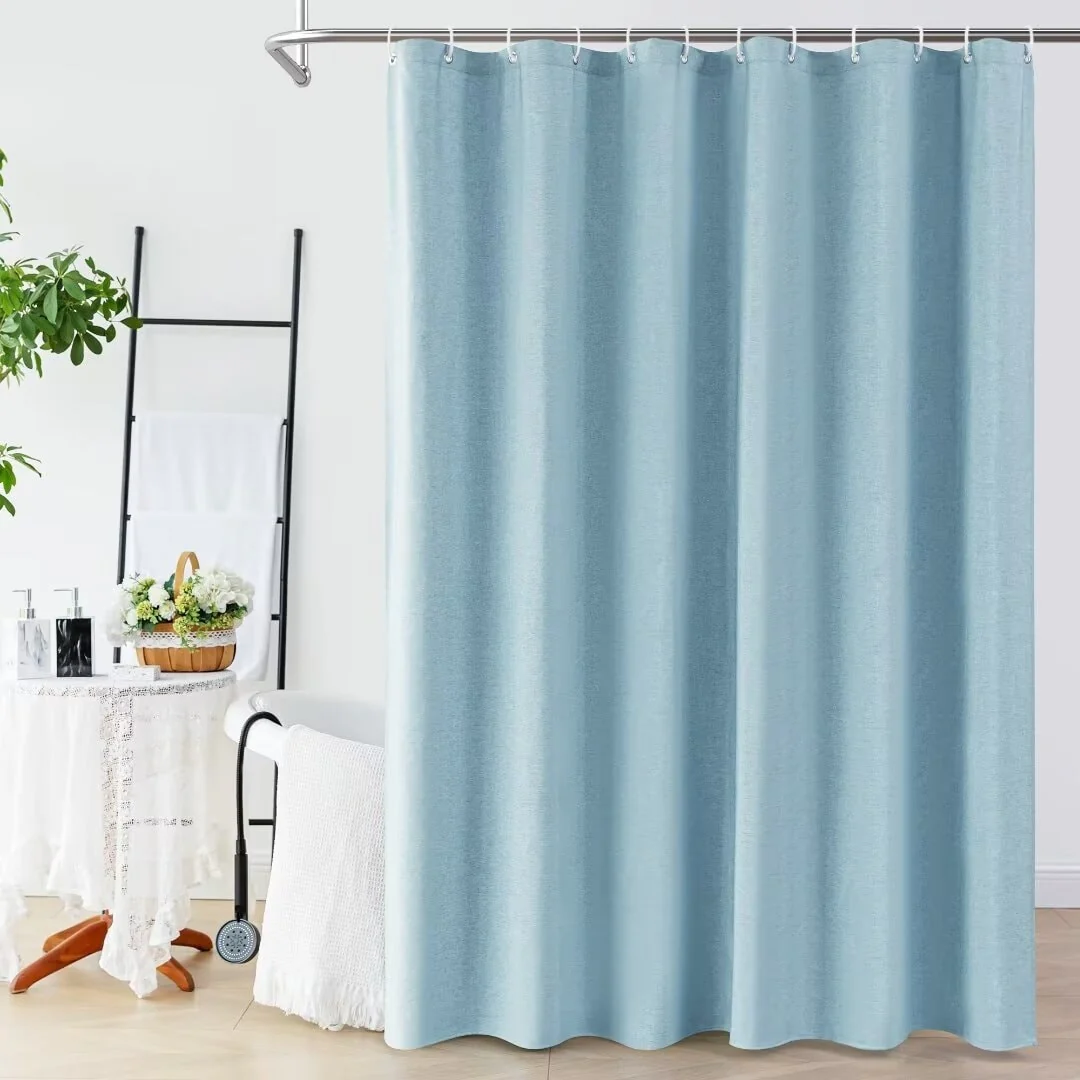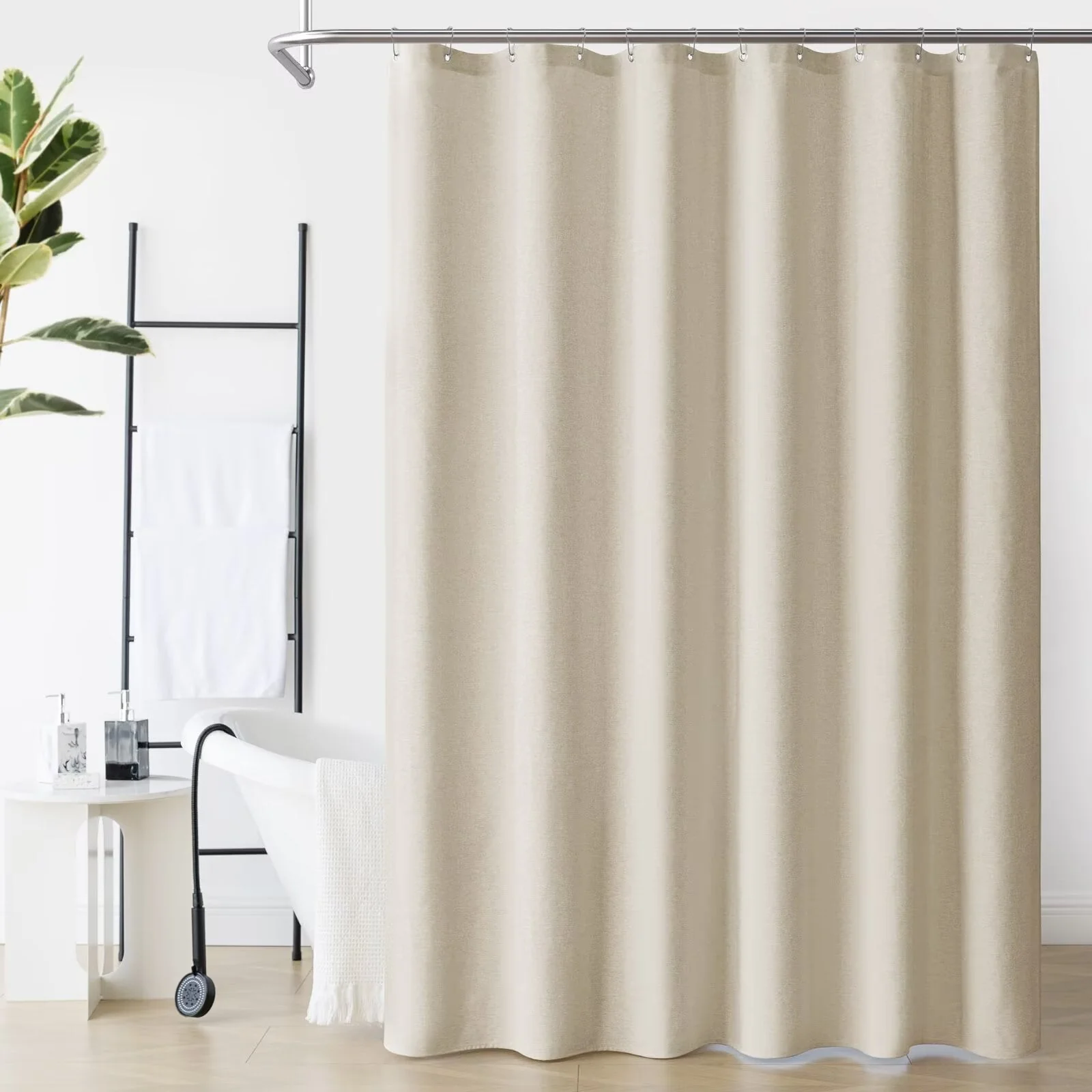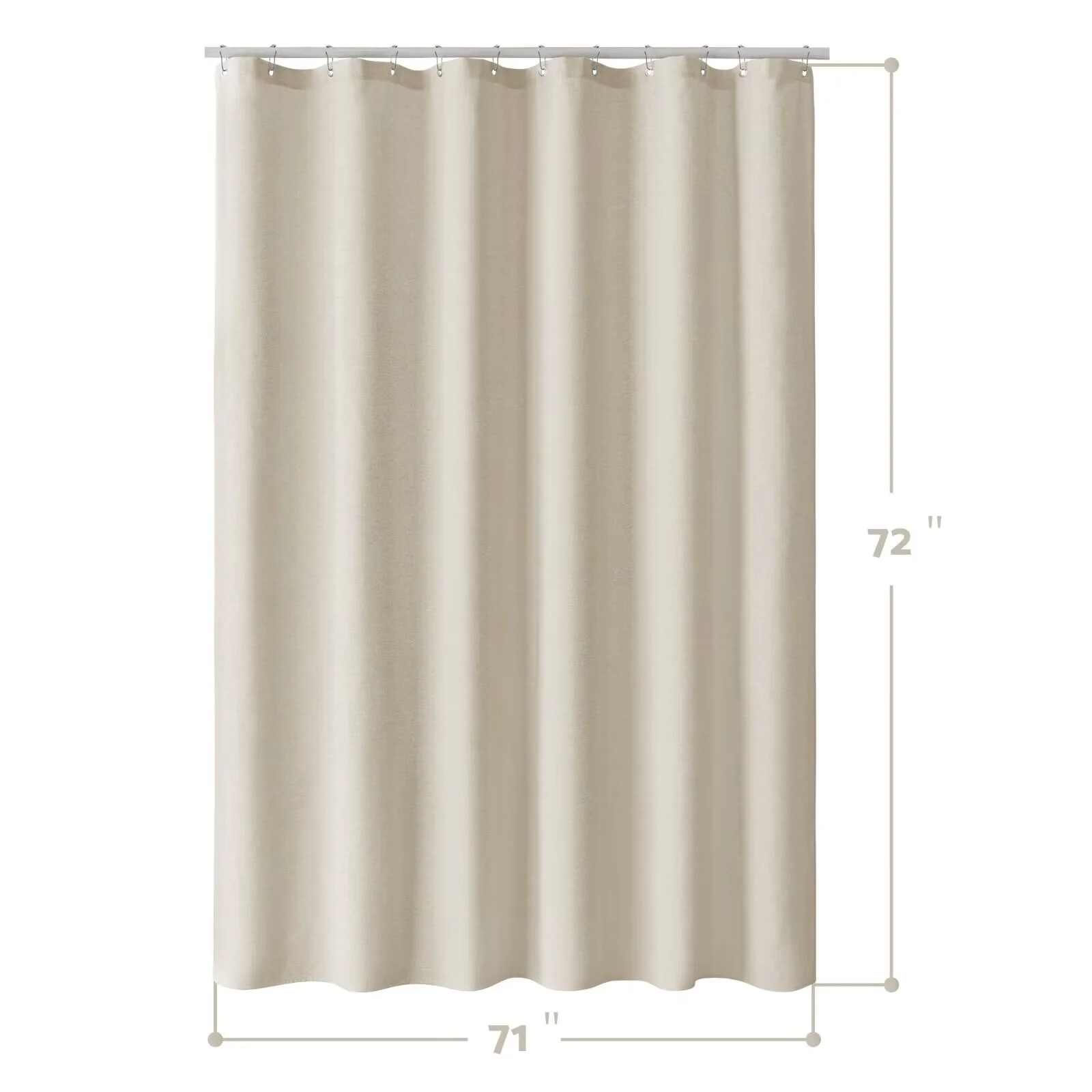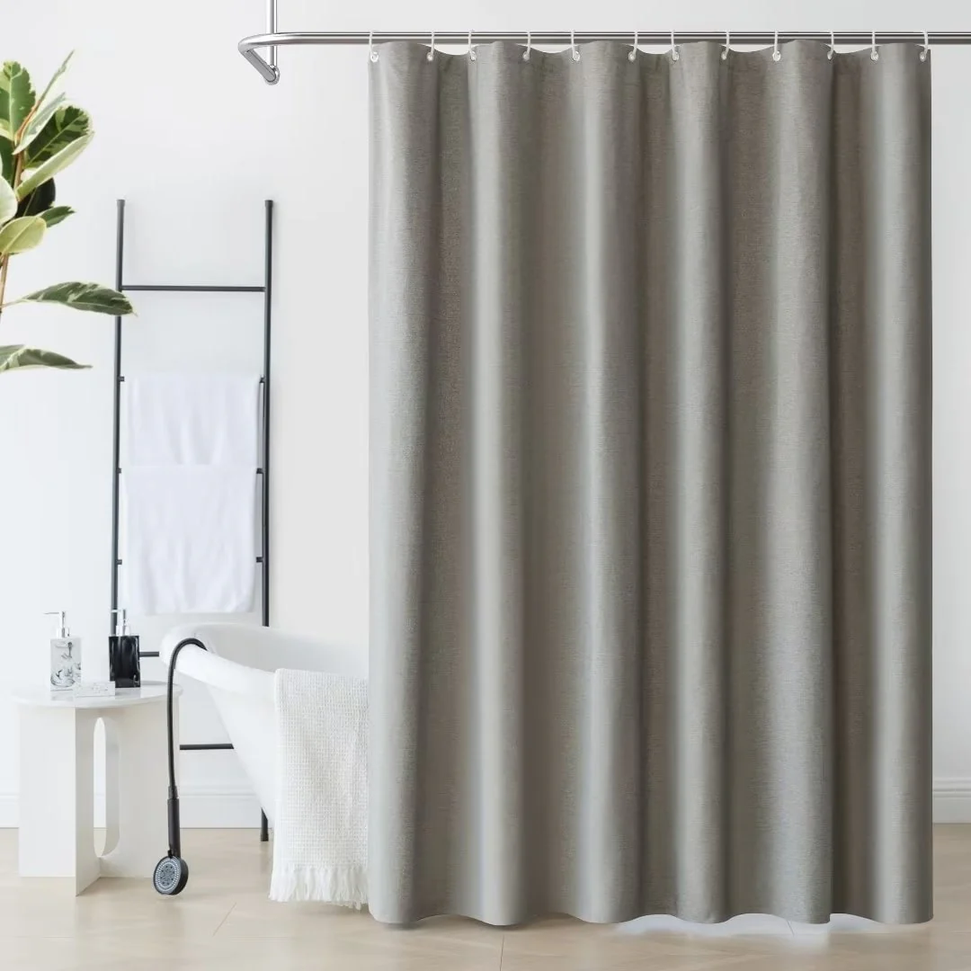 Made of 200GSM heavy duty polyester linen fabric, making this shower curtain very draping and easy to keep in place. The linen texture enriches its appearance, adds elegance and luxury to your bathroom. Modern and simple design is sure to match different bathroom styles. This waterproof fabric shower curtain can well repel the water and promote the formation of water droplets, causing water to roll off the surface quickly. 12 plastic hooks included in the package, making it a complete purchase, help save your time and money. Â