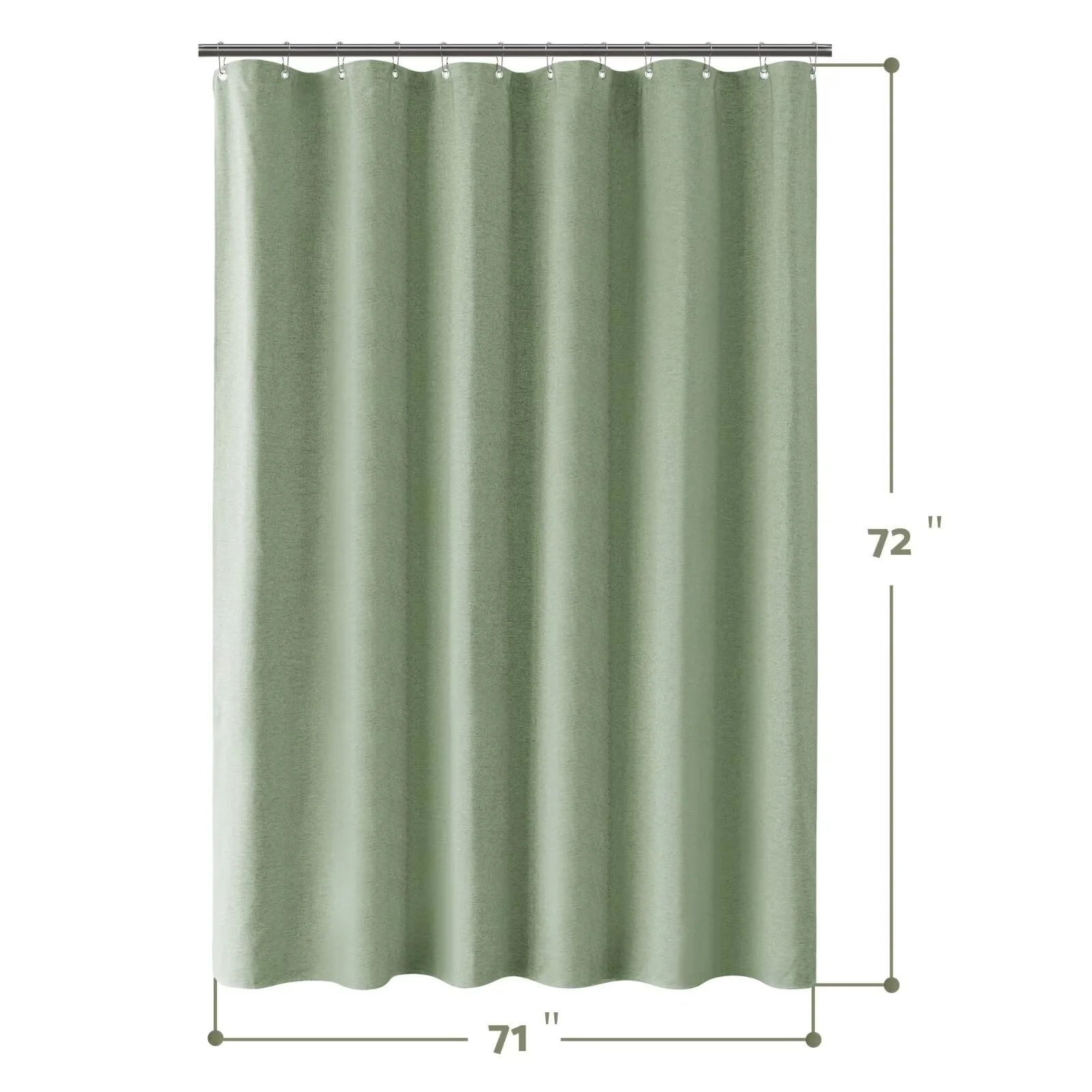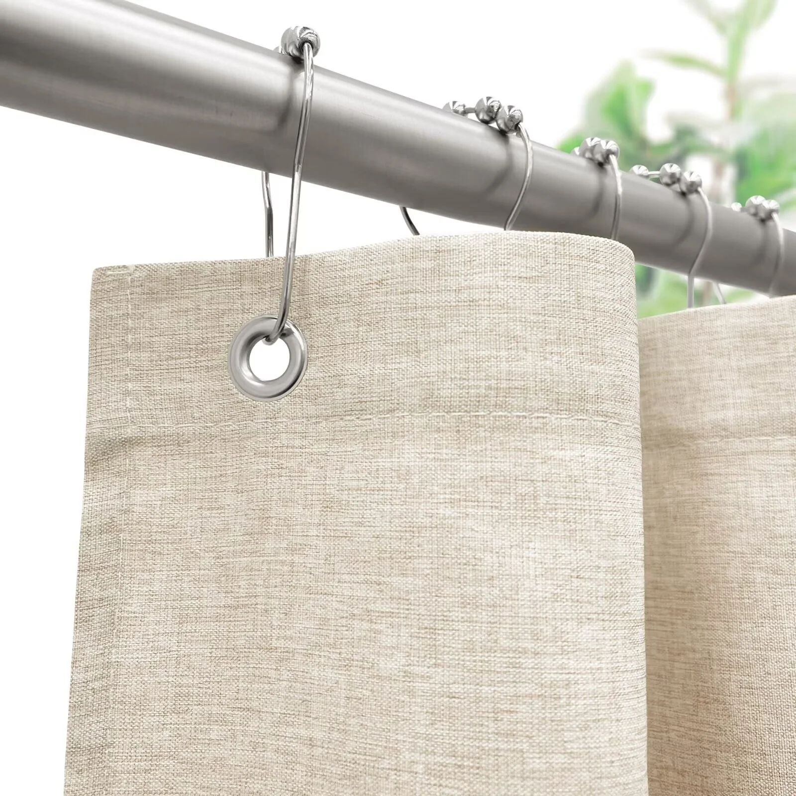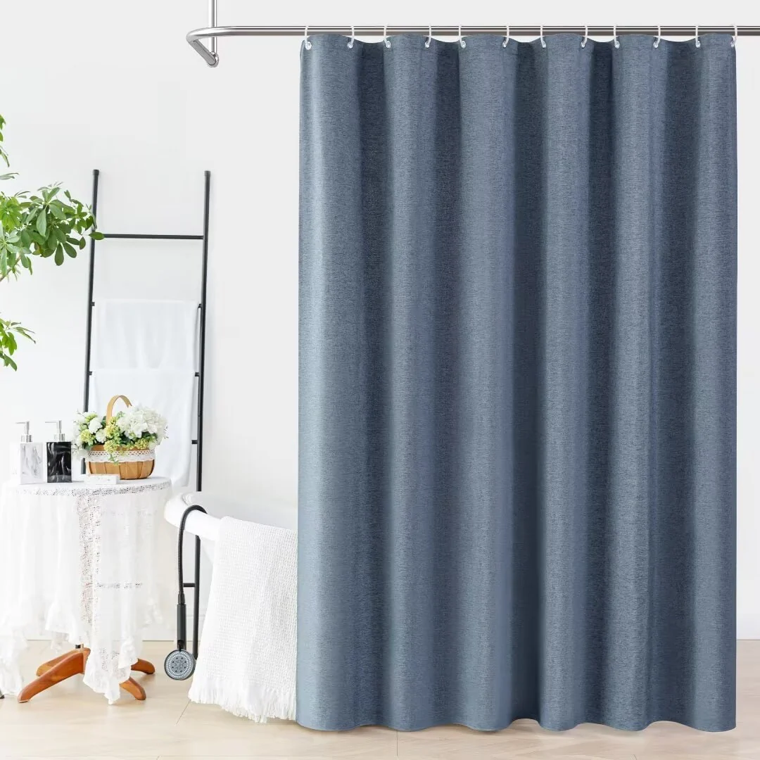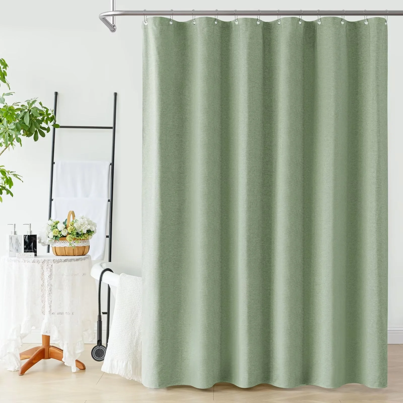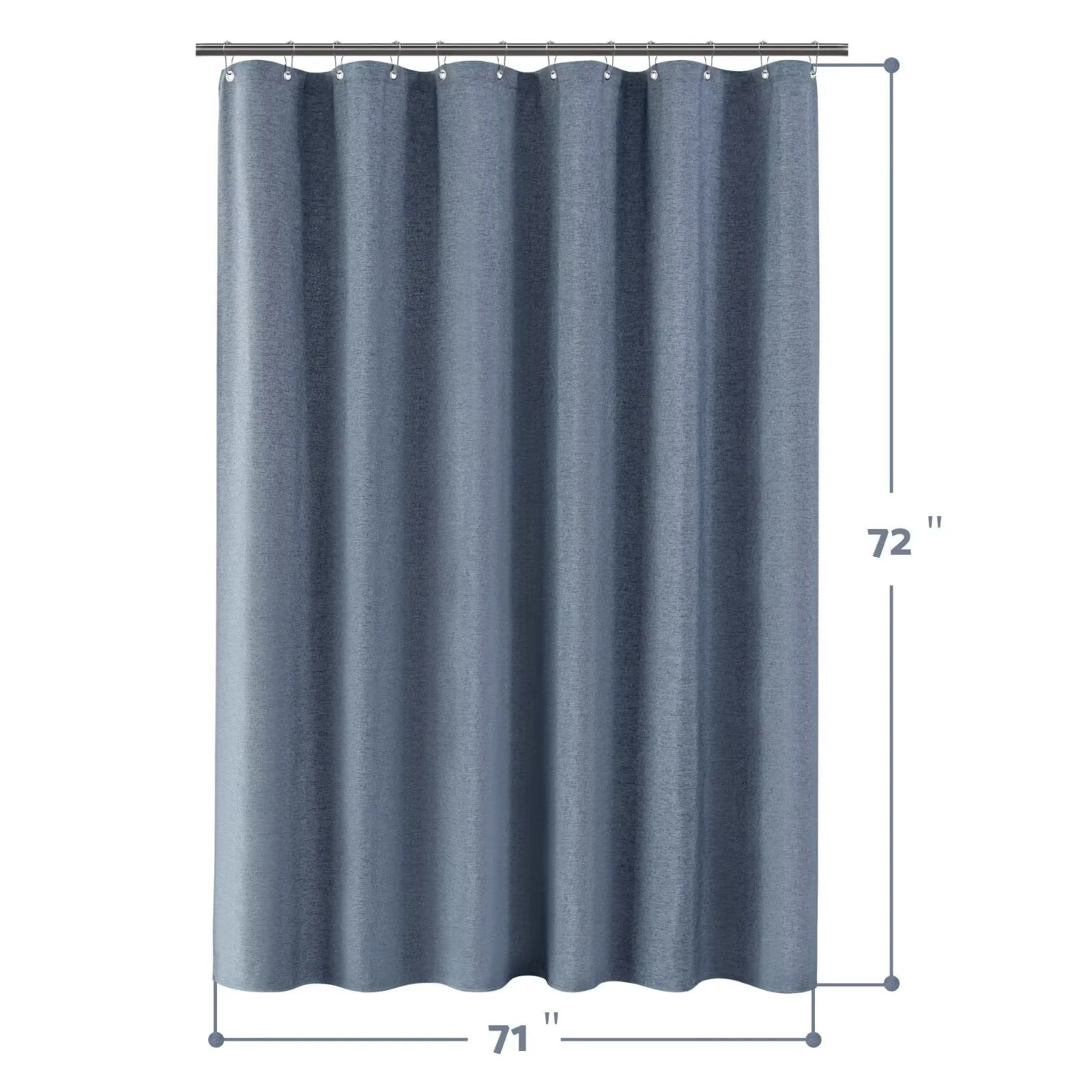 Made of 200GSM heavy duty polyester linen fabric, making this shower curtain very draping and easy to keep in place. The linen texture enriches its appearance, adds elegance and luxury to your bathroom. Modern and simple design is sure to match different bathroom styles. This waterproof fabric shower curtain can well repel the water and promote the formation of water droplets, causing water to roll off the surface quickly. 12 plastic hooks included in the package, making it a complete purchase, help save your time and money. Â