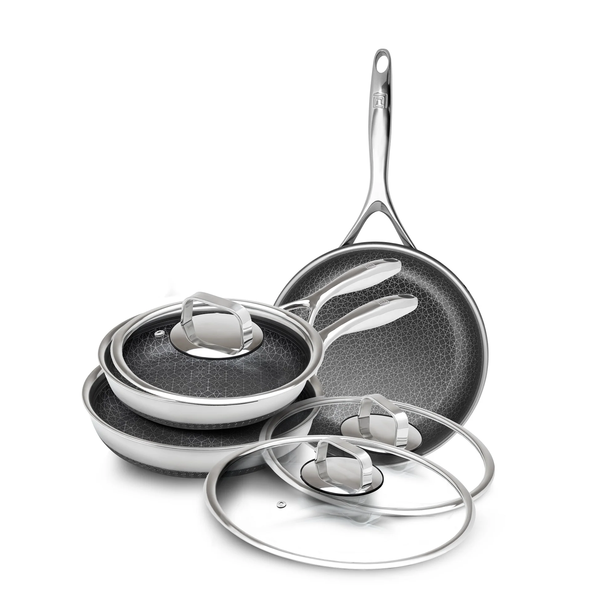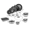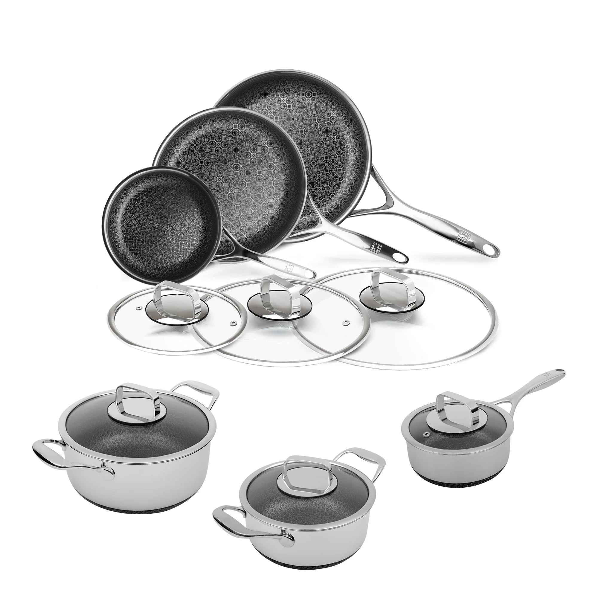 - 12-Piece Set: Includes 8", 10", 12" Frypans with matching glass lids, 3QT Pot with Lid, 6QT Pot with Lid, and 1.5QT Sauce Pan with Lid.