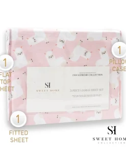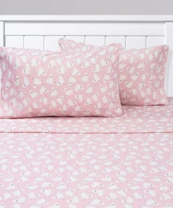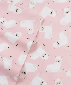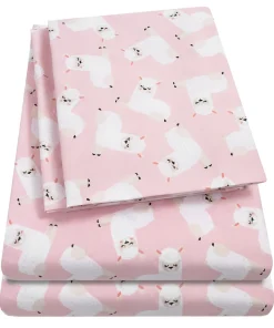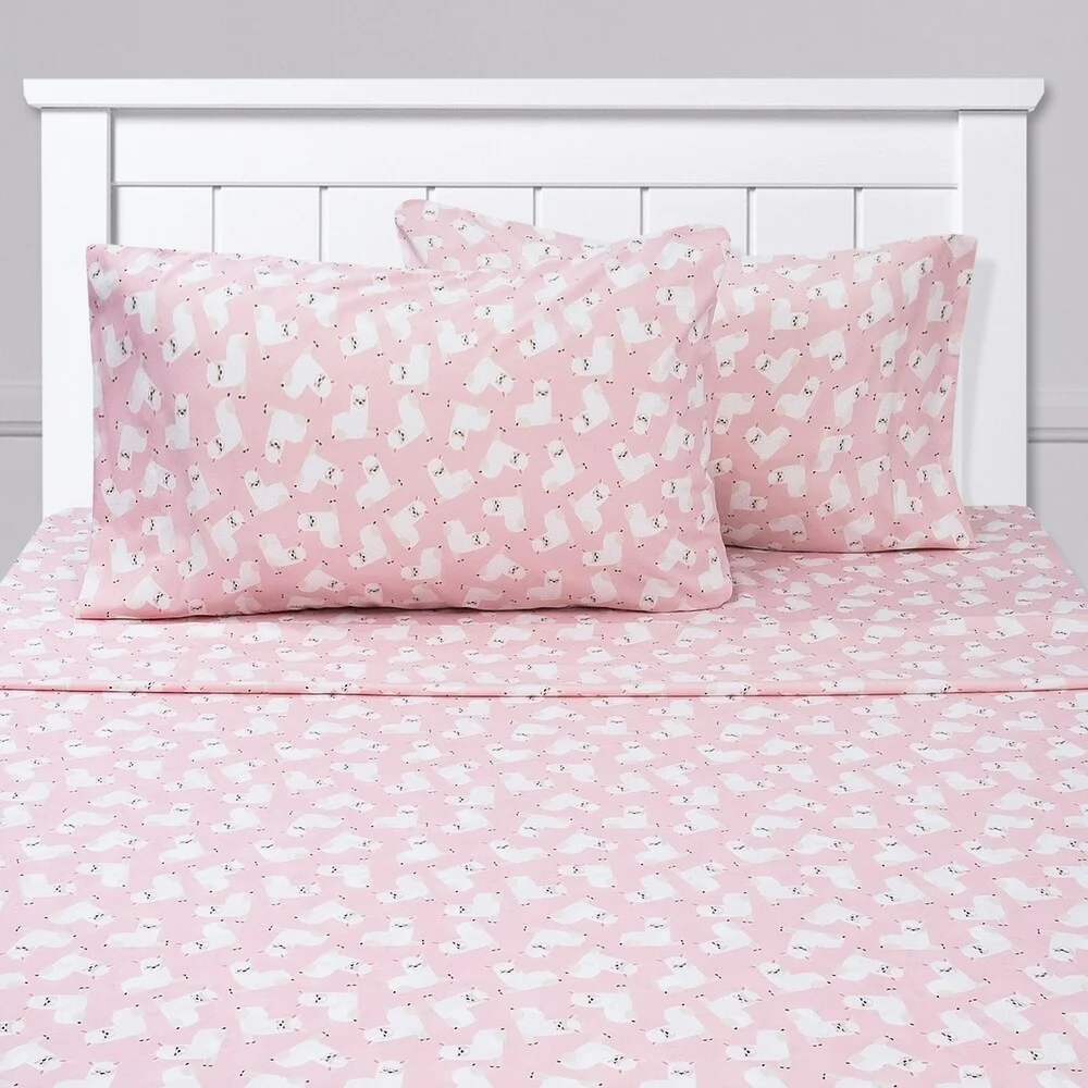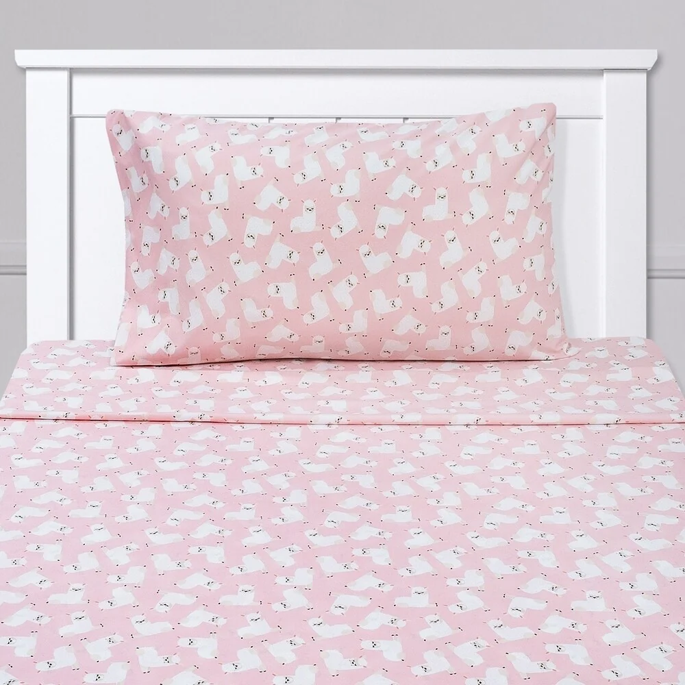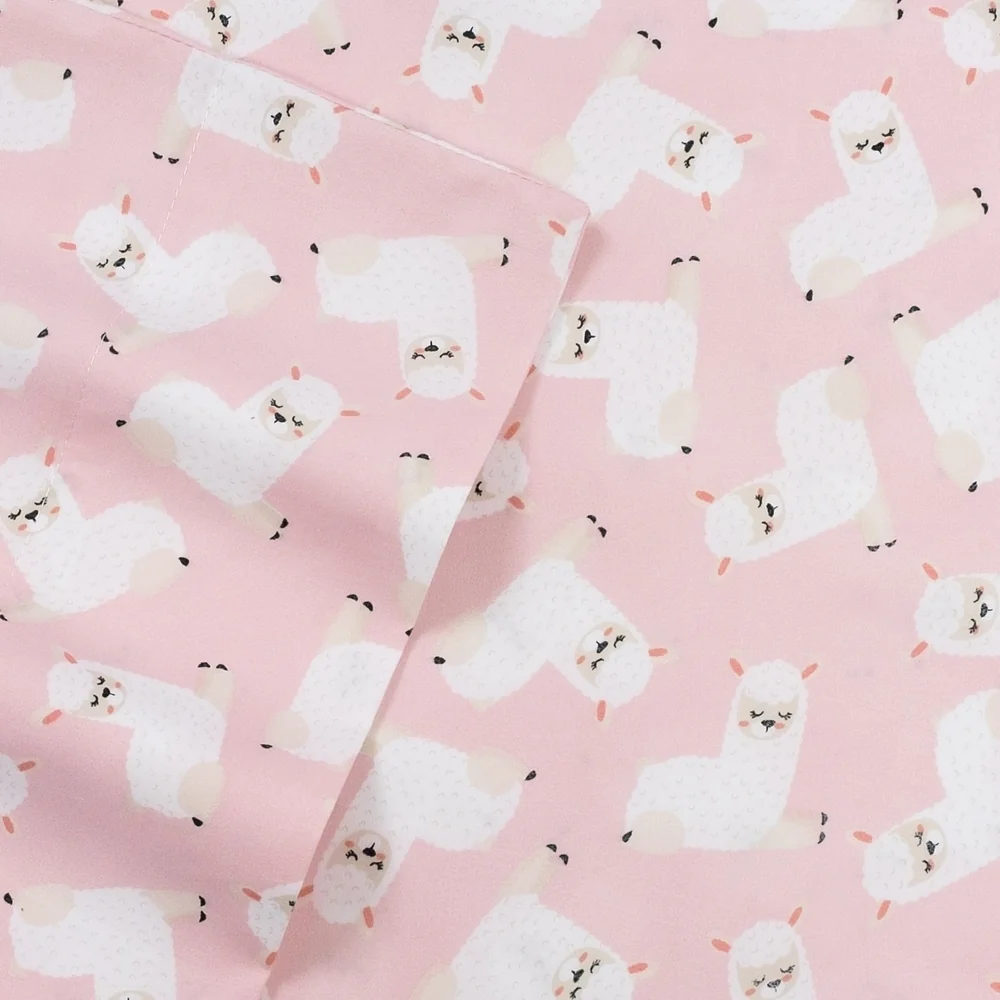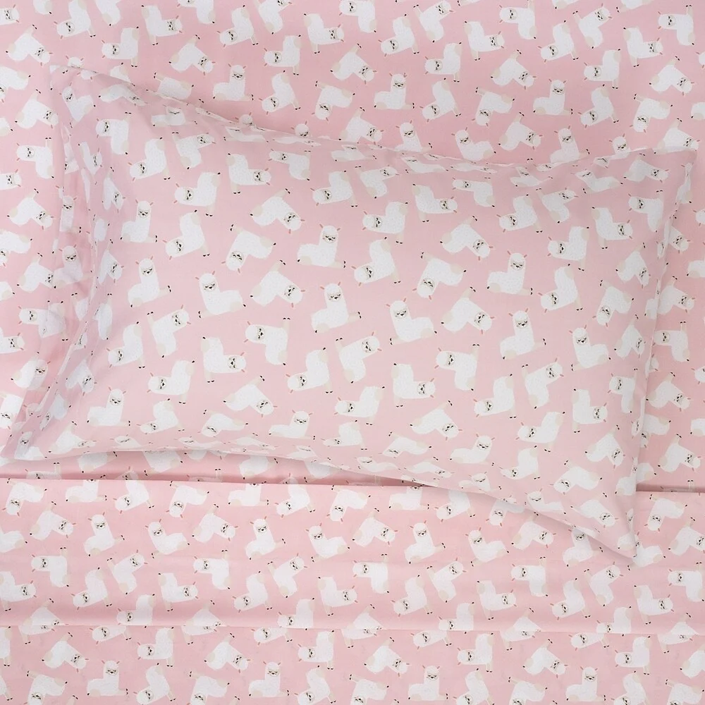 Boasting adorable fluffy white llamas, this sheet set brings animal-inspired charm to your little one’s sleeping space. Featuring an all over llama print and a double brushed microfiber construction, these sweet sheets are supersoft. Machine washable and wrinkle resistant. Twin and Twin XL Sets includes 1 fitted sheet, 1 flat sheet and 1 pillowcase, Full Set includes 1 fitted sheet, 1 flat sheet and 2 pillowcases.