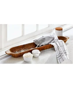 entertain with style! impress your guests with a long, dramatic dough bowl. perfect to serve baguettes or use as a focal centerpiece to house a variety of decor pieces. handcrafted and finished with a food-safe lacquer. slight variations are to be expected each piece is one-of-a-kind, no two pieces will be exactly alike. mix and match with a range of mango wood selections from tag.