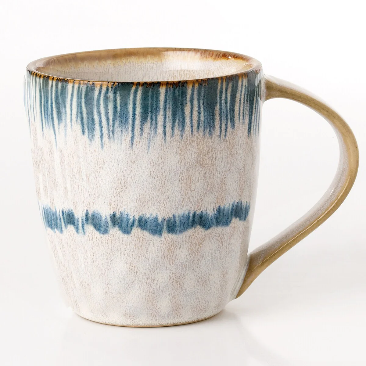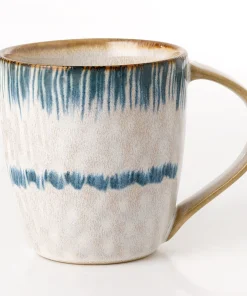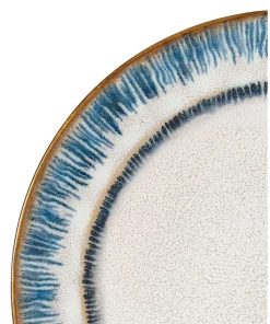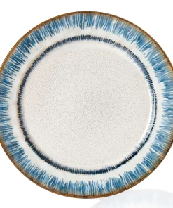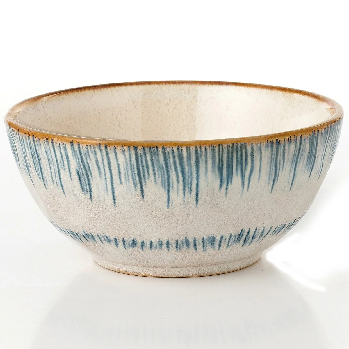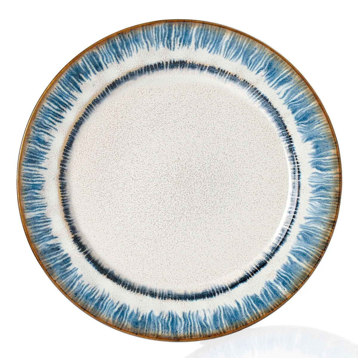 This   set features a blue shaded border with a slight speckled interior design to   create a dazzling look to this dinnerware set. This sturdy stoneware set features   different shades and tints of blue along the border, finished off with a   brown trim. The bowls and mugs have a   slight texured feel. Dinner plates and   salad plates have a shiny finish with a slight speckled interior.. Included in this 16 piece set are: 4-   Dinner plates measuring 10.5" in diameter and 1" tall. 4- Salad plates measuring 8" in   Diameter and .75" tall. 4- Bowls   measuring 6"x6"x2.5" and holds 26 ounces. 4-Mugs   measuring 5"x3.5"x4"   and holds 15 ounces. Dishwasher and Microwave safe   Â