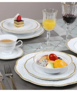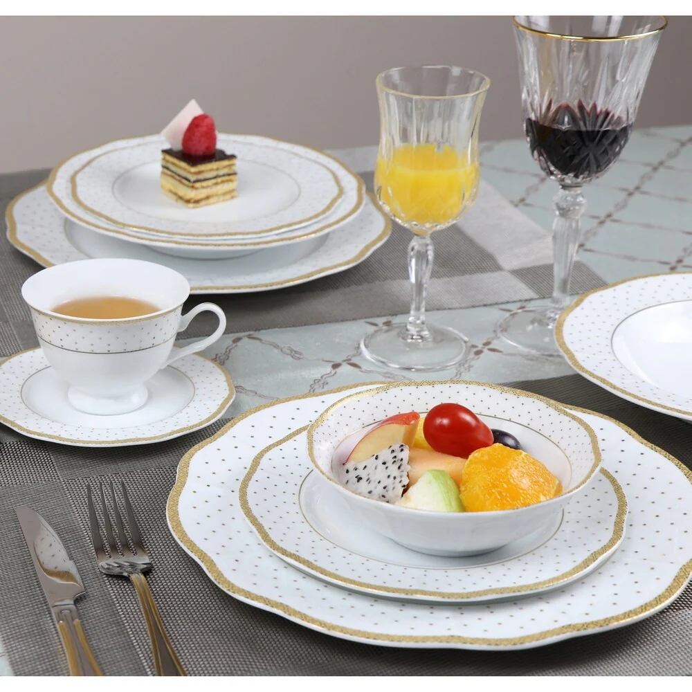 This elegant and sophisticated wavy fine china dinnerware set adds a modern touch to a traditional look. Fine gold dots on the border add a fun and upbeat look while still maintaining an old world style. Create a new and exciting look with a wavy shape dinnerware set. Service for 4, each set includes: 4-10.5" Dinner Plates, 4-8.5" Soup Bowls (holds 8 ounces), 4-7.5" Salad or bread and butter dish, 4-Cups 9holds 6 ounces), 4-5.5" saucers, and 4-5.5" x 1.5" Fruit or dessert bowls (holds 10 ounces). Dishwasher Safe.