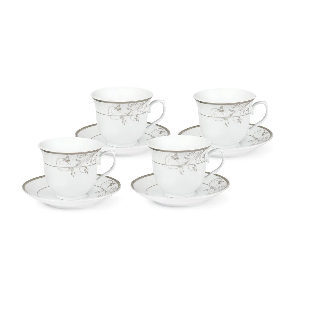 Serve hot beverages to your guests in style with this classic-style tea or coffee set made from high-quality porcelain. The elegant and delicate white round cups and saucers feature a beautiful silvertone floral pattern that adds a touch of sophistication to your table setting. This set includes service for four and is dishwasher safe, making it effortless to clean.