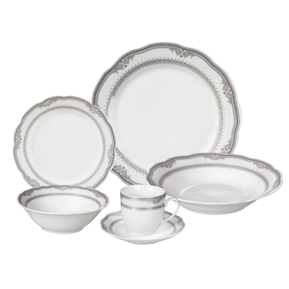 Impress your guests with the Lorren Home Trends ‘Victoria’ 24-piece Porcelain Dinnerware Set. Its sleek silver wavy edging adds a touch of sophistication to any table setting, while its durable porcelain construction ensures worry-free use for years to come. Perfect for everyday use or special occasions.