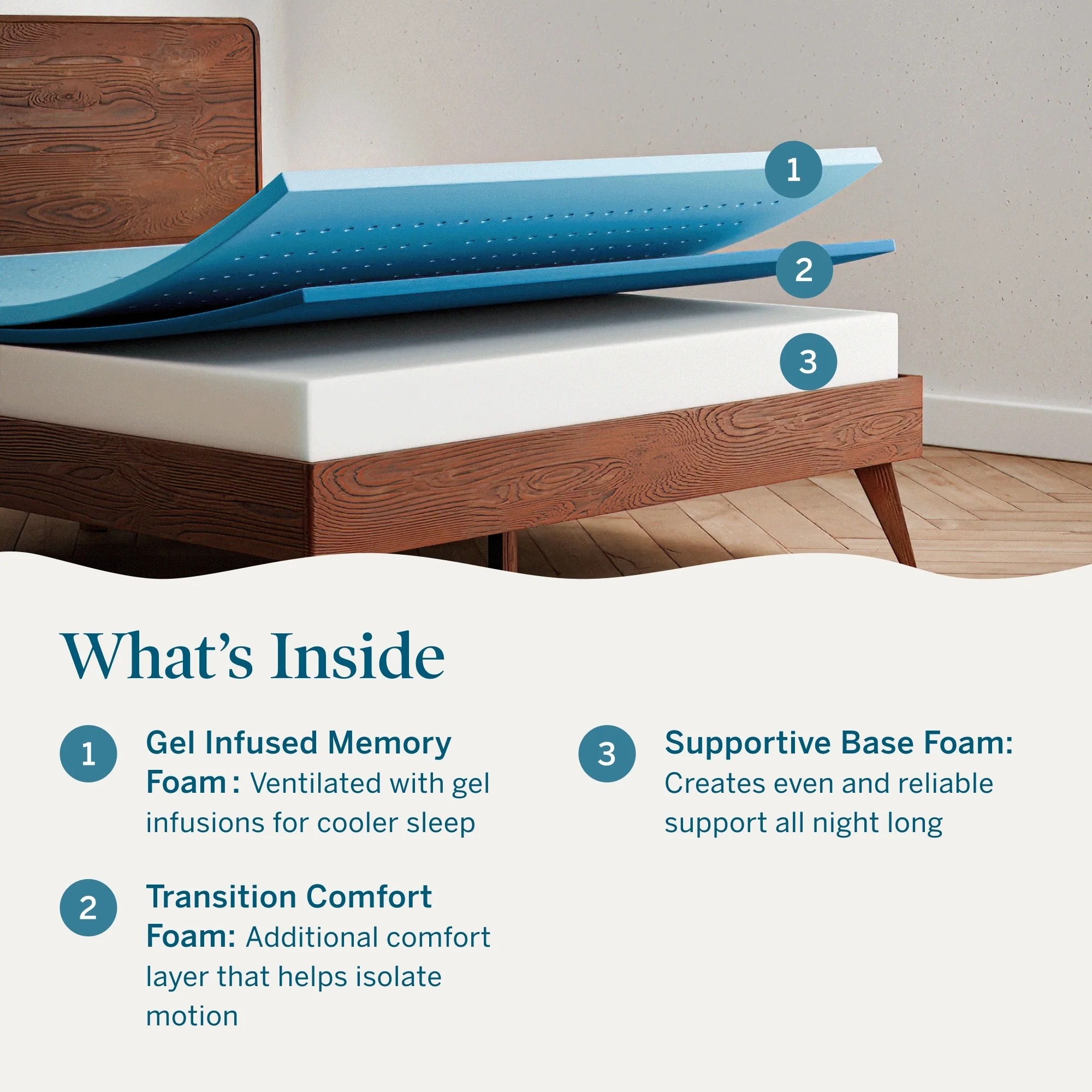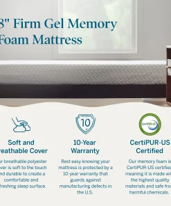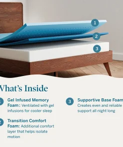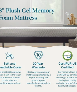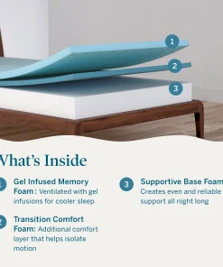 - COOLER SLEEP: Cooling gel is infused in the memory foam to help regulate your sleep temperature and keep you comfortable all night long Â