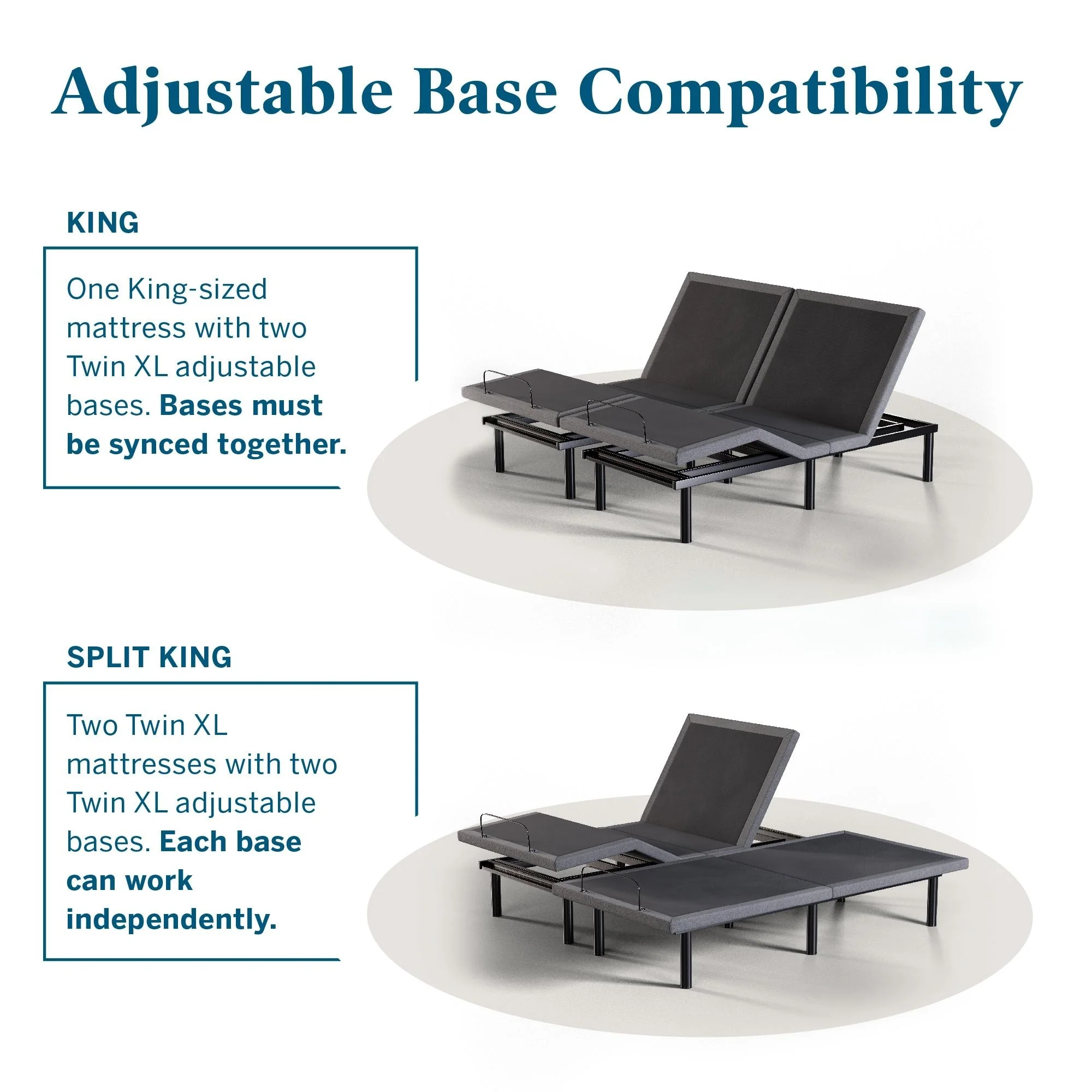 - Split King: 72 inches W x 84 inches L x 10 inches thick (two mattresses, two bases)