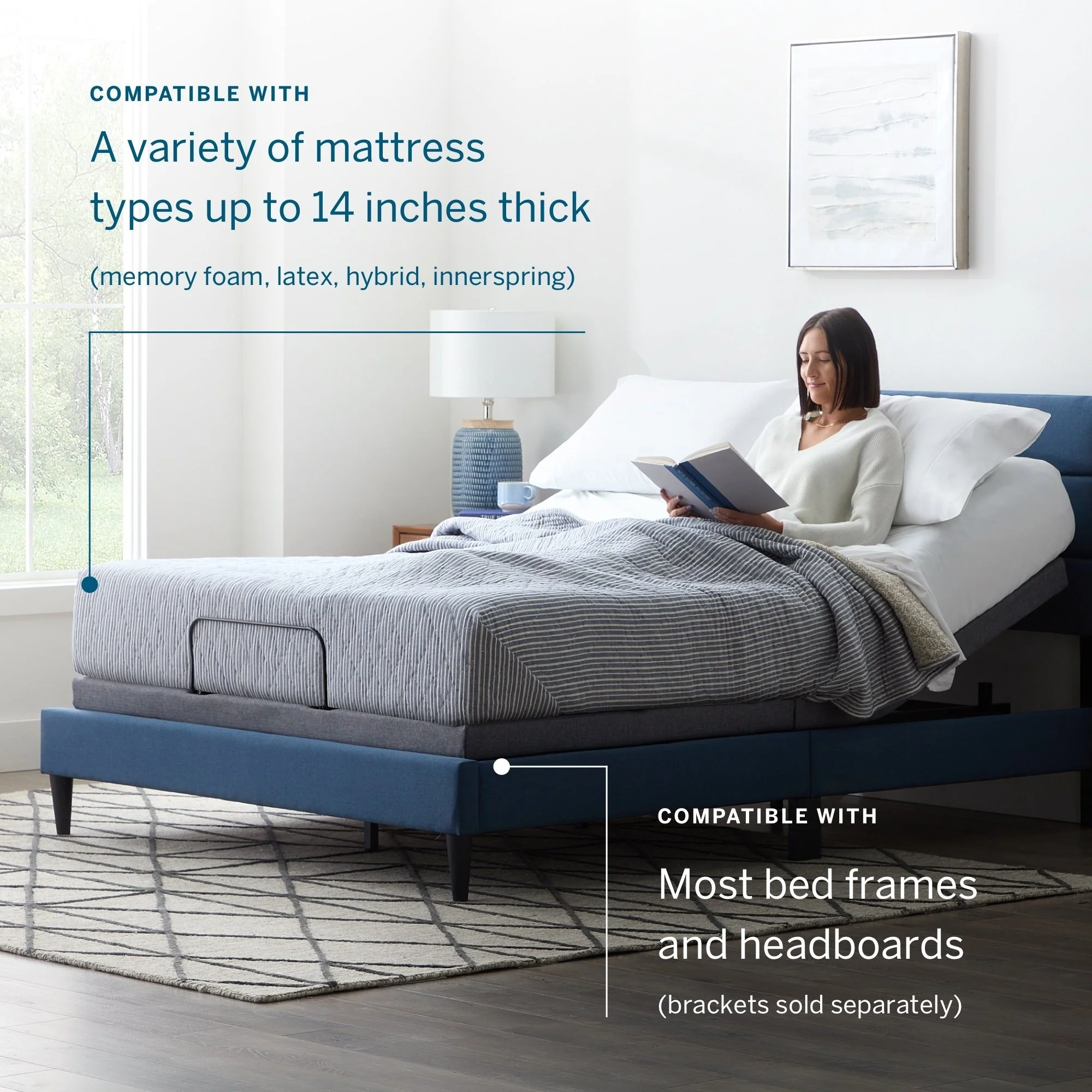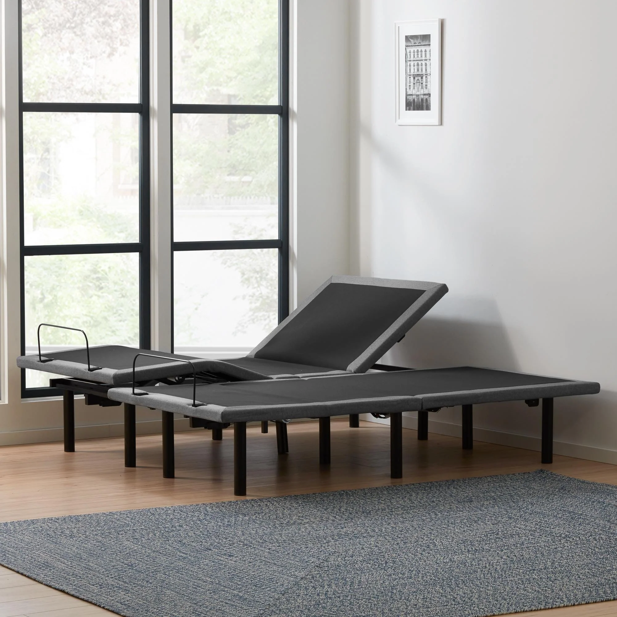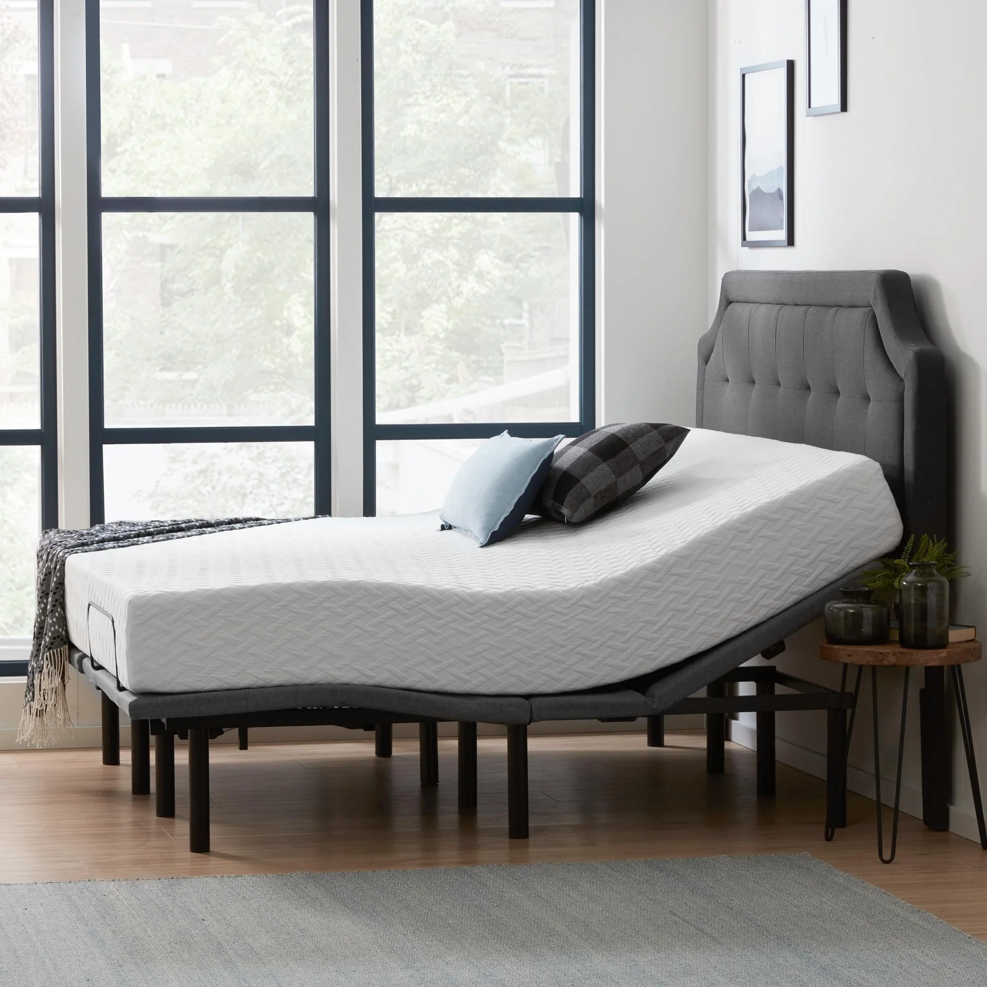 - Adjustable bed base with independent head incline (0-60 degrees) and foot incline (0-45 degrees)