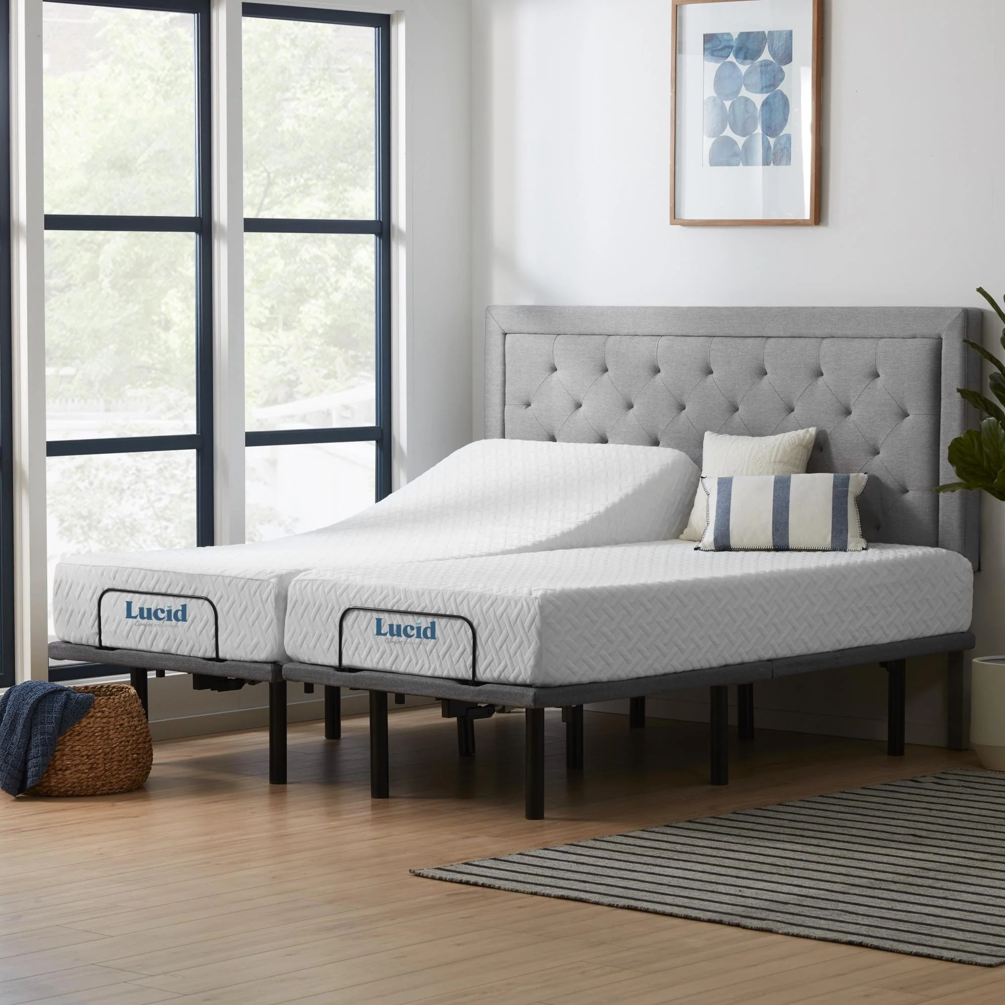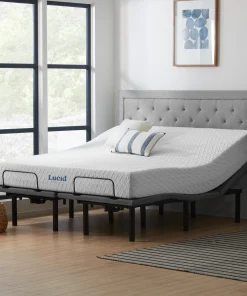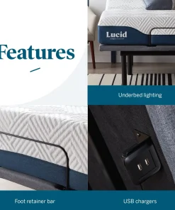 Revamp your sleeping experience with the LUCID Comfort Collection Deluxe Adjustable Bed Set and 10-inch Gel Memory Foam Mattress. This luxurious bundle combines a gel-infused memory foam mattress with an adjustable bed base that comes with head and foot incline, under bed lighting, dual USB charging ports, head and foot massage, and assembles in less than 5 minutes. The mattress’ PureFlowâ„¢ ventilated design and gel-infused memory foam help regulate sleep temperature and provide consistent support throughout the night. Upgrade your sleep with this customizable and comfortable sleep bundle today.