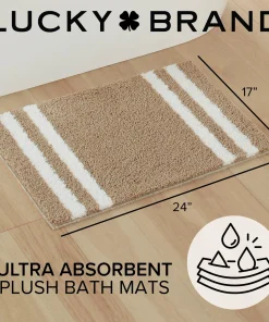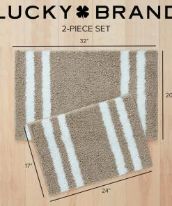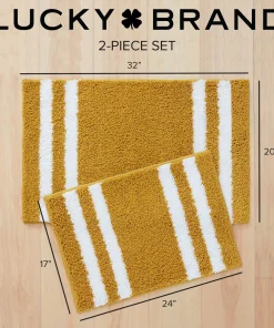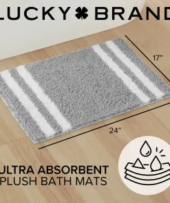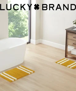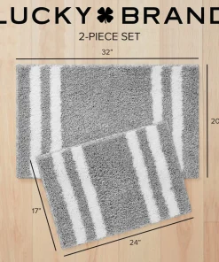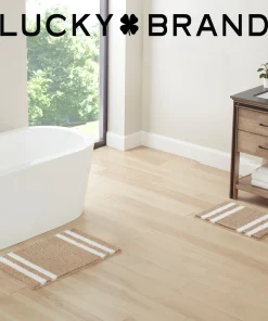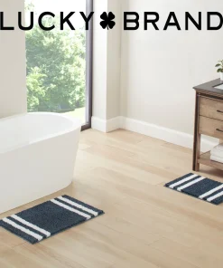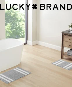 Turn your bathroom floor into a focal point with the Lucky Brand Harden heathered bath rugs. With a stylish edge striped design, these bath rugs are functional yet trendy and will add a unique look to any bathroom. These bath rugs are highly absorbent and fast drying for elevated use. Available in an array of neutral color options and various sizes including 17×24 inch 20×34 inch, and a 2pc set with both 17×24 inch and 20×32 inch. Choose the option best for your bathroom’s decor. For extra grip, they also feature an anti-skid TPR backing that ensures your bath rugs stay securely in place. Easy care: machine washable and hang dry for best results. 100% Micropolyester. Imported.