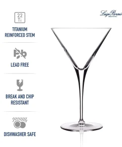 Elevate your cocktail evenings with the Luigi Bormioli Crescendo Martini Glasses, a set of four designed to bring clarity, durability, and sophistication to every sip. Made from SON.hyx – a high-tech lead-free crystal glass – each glass offers extraordinary brilliance while being highly resistant to breakage. Whether you’re curating your glassware collection or setting the stage for a cocktail night, these glasses make an impression that goes beyond their elegant look. The 10 oz capacity strikes the ideal balance for your favorite drinks, from classic martinis to creative cocktails. Precision-engineered laser cut rims provide a refined drinking experience, while titanium reinforced stems offer added strength without compromising style. Designed with a flat foot for better balance and ease of handling, these glasses are as functional as they are beautiful. When the evening winds down, cleanup is simple—this set is completely dishwasher safe, making it a reliable and stylish choice for everyday use or celebratory moments. Whether displayed as part of your home bar essentials or brought out to impress your guests, this martini glass set seamlessly blends sophistication with modern convenience.Â