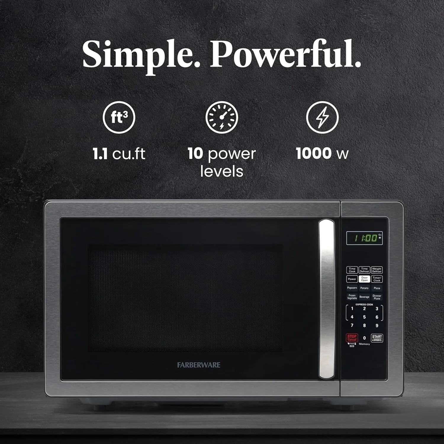 1.1 Cu Ft Countertop Microwave with LED Lighting, Child Lock & Easy Clean Black Stainless Steel